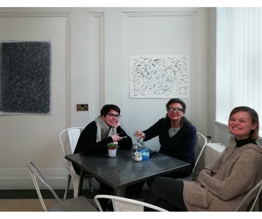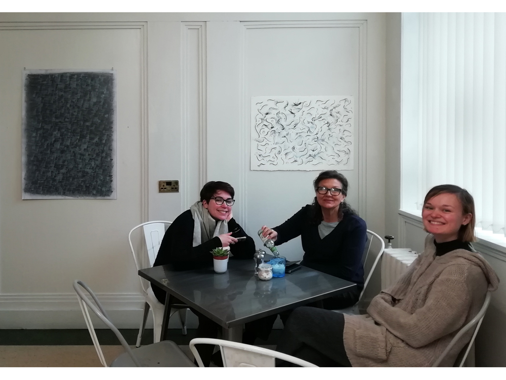 Three of the artists. On the wall to the right a work by Jo Lane...on the left a work by Janine Hall