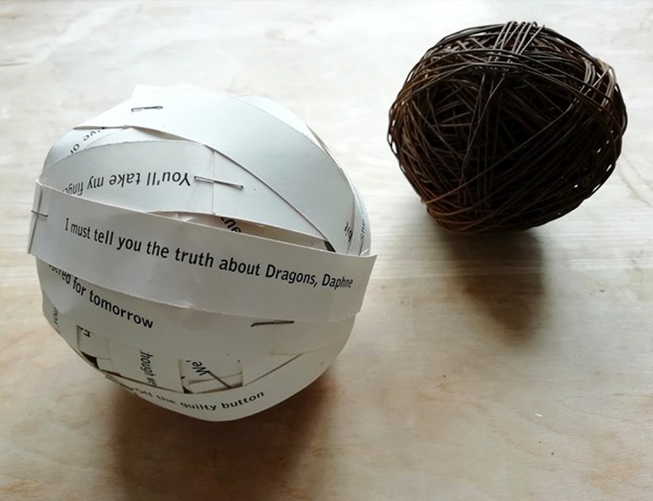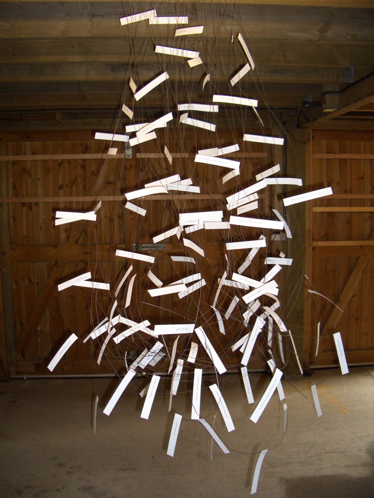 In its recylced from I have condensed the space (wire ball) and joined the words into one length and wound them together. the words have merged into one internal hum or been muted… who knows. They are still there.